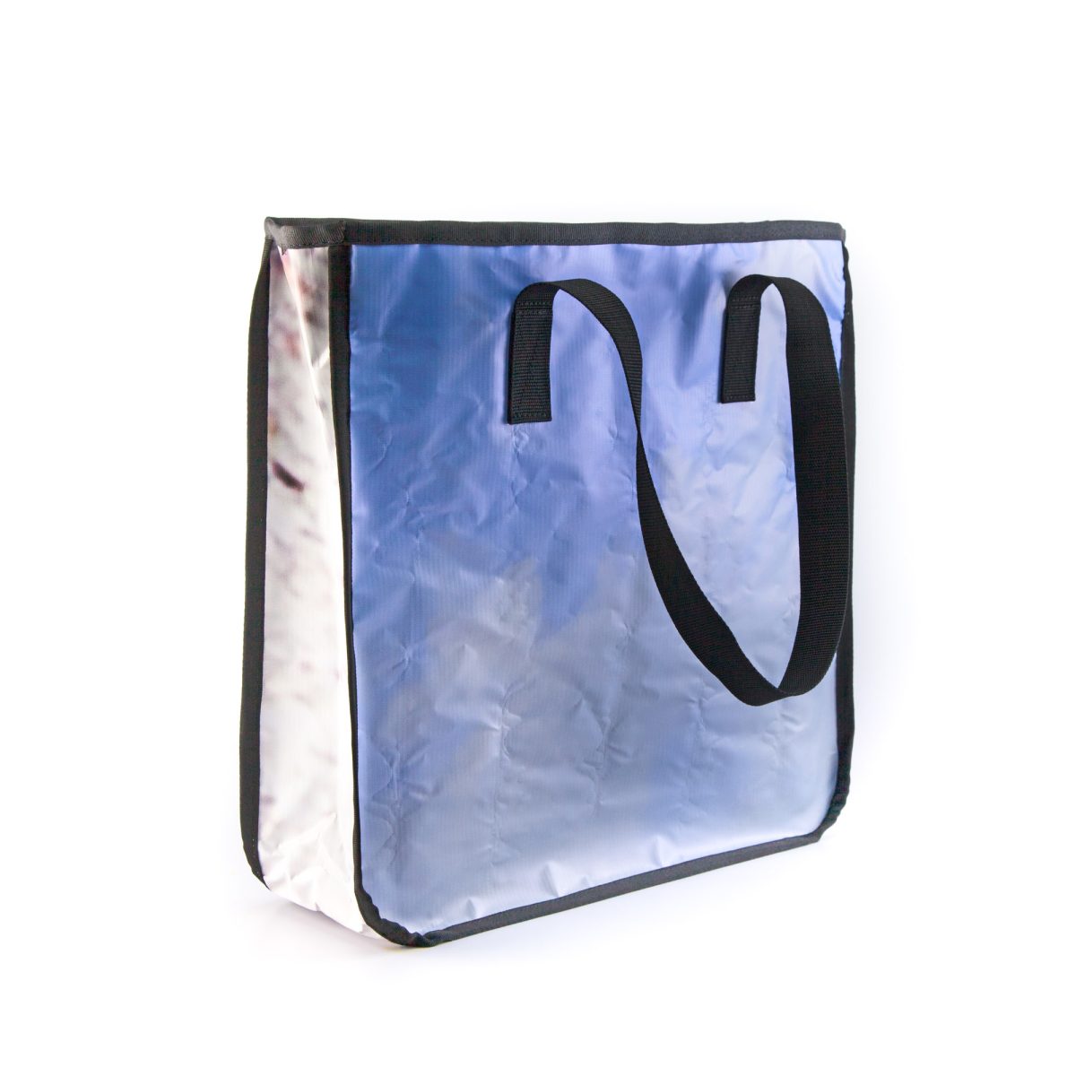 Bolso tipo Tote fabricado con material banner reciclado de vallas y pendones, asa de mano en reata negra, bolsillo interno, medidas: 40cm de alto x 40cm de ancho x 10cm de profundidad y 16lt de capacidad.